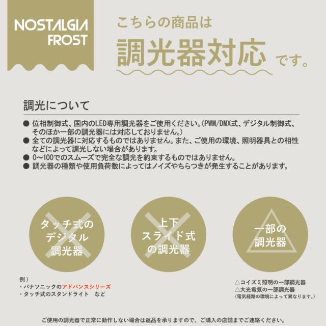 | 備考 | 【調光について】 ・位相制御式、国内のLED専用調光器をご使用ください。(PWM/DMX式、デジタル制御式、そのほか一部の調光器には対応しておりません。) ・全ての調光に対応するものではありません。またご使用の環境、調光器具との相性などによって調光しない場合があります。 ・0−100でのスムーズで完全な調光を約束するものではありません。 ・調光器の種類や使用負荷数によってはノイズやちらつきが発生することがあります。 ※自動点灯機能付器具、リモコン付の器具等では動作しない可能性がございます。 ※ 断熱材施工器具[SB、SGI、SG形表示器具]、密閉型器具には使用しないでください。(このほか使用器具の種類によって寸法的、熱的、その他の状況により使用できない場合があります。) ※位置表示灯内蔵形スイッチ(ホタルスイッチ)や消灯時でも微小電流が流れる回路でご使用になる場合、スイッチを切っても微弱点灯する場合がございます。⇒不具合がある場合は返品・返金対応いたします。 ※電球のみの販売です。その他の器具は別でお買い求めください。 ※製品の設置に関わる工事費、点灯の不具合に伴い発生する費用、二次的損害(設置納期遅延、施工費、人件費、業務に支障が生じた際の損失等)など一切の責任を負いかねますので予めご了承ください。 ※必ずお使いの配線器具(照明スイッチ)及び照明器具メーカーが指定している接続灯数・負荷容量内でご使用ください。点灯の不具合や製品の寿命が著しく短くなる原因となります。 ※LED電球は照明器具や調光器、電気経路との相性がございますので、業務用として大量に本製品を使用される場合等、全量ご購入前にお使いの環境に適用されるか一度ご確認ください。 |