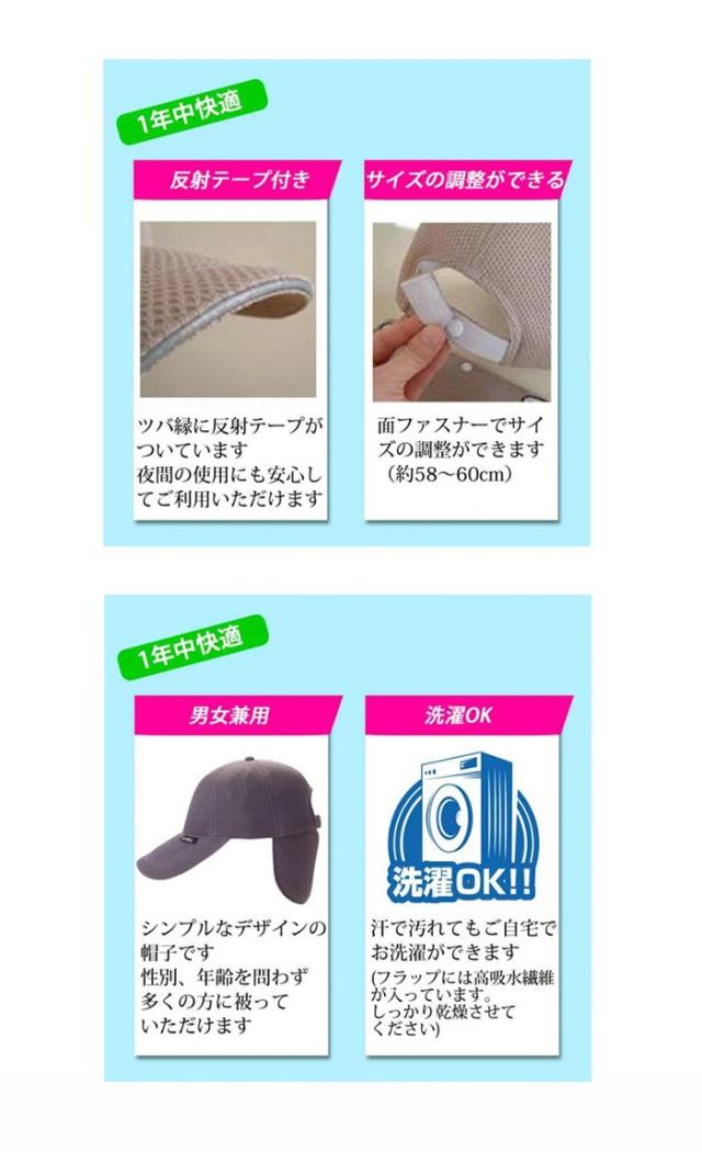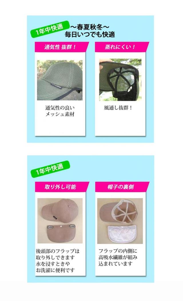 クールビットの日除けフラップは着脱自在なボタンを中心にして、帽子に反転して収納。常に裏地が髪に接触するために表地が汚れません。頭を冷やす位置も変えられ2WAYで楽しめます。四季を通じて直射日光を遮断し、後首筋を有害紫外線から守ります。また運動神経を司る後頭部を直接冷やし疲労感を軽減するので、動作キビキビ!冷えるフラップ部分は洗濯しても劣化しにくく、水に浸して繰り返し使えます。coolbitシリーズは人と地球に優しい新商品なのです。