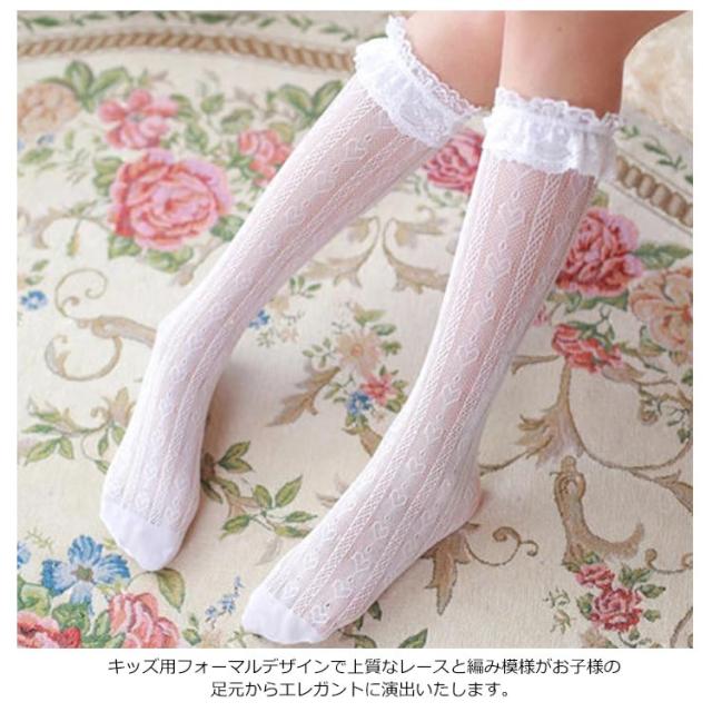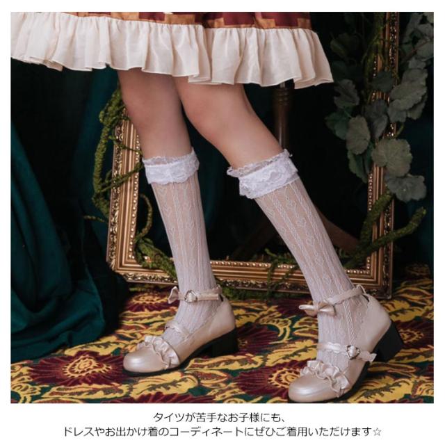| キッズ用フォーマルデザインで上質なレースと編み模様がお子様の足元からエレガントに演出いたします。 お子様の身長によりハイソックスやニーハイソックスで履けます! タイツが苦手なお子様にも、ドレスやお出かけ着のコーディネートにぜひご着用いただけます☆ メッシュ地で通気性が良いので、長時間履いててもOK♪ ロング丈で上品に見えますし、オススメですよ。 | |