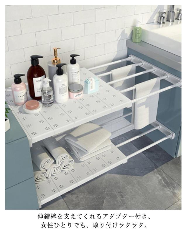 | しっかりした作りで、十分な耐荷重。伸ばした先まで棚として使えるのが魅力。 好きなところに収納を。 伸縮棒を支えてくれるアダプター付き。女性ひとりでも、取り付けラクラク。 小物が多く乱雑になりがちな台所も棚があればスッキリ。 | |