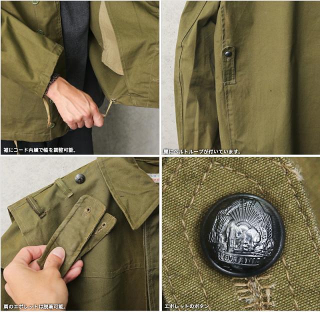 | 商品説明 | 実物 USED ルーマニア軍 ウォータープルーフ ジャケット のご紹介です。 ルーマニア軍から実物放出の撥水性のあるウォータープルーフ ジャケットが入荷しました。 デザイン性が良く、肩が2重のレイヤードになっていて、付け根にはアクションプリーツもあり機動性も良いです。 裾、袖先にコードが内蔵されていて幅を調整可能です。 色合い、シルエットも非常に良くデニムなどと相性がすごく良いです! 肩のエポレットも脱着可能なので、エポレットが苦手な方も嬉しい仕様です。 放出自体がレアで、ファッション性が非常に高い魅力的なジャケットだと思います。 | ||||||||||||||||||||