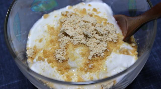 上の写真は、きな粉ヨーグルト。ある日の僕(店長おかざき)の朝食です。