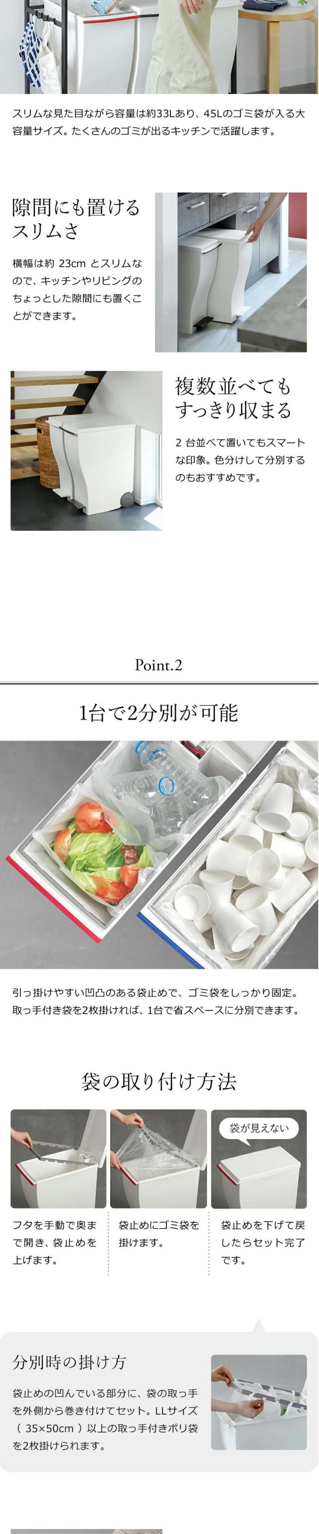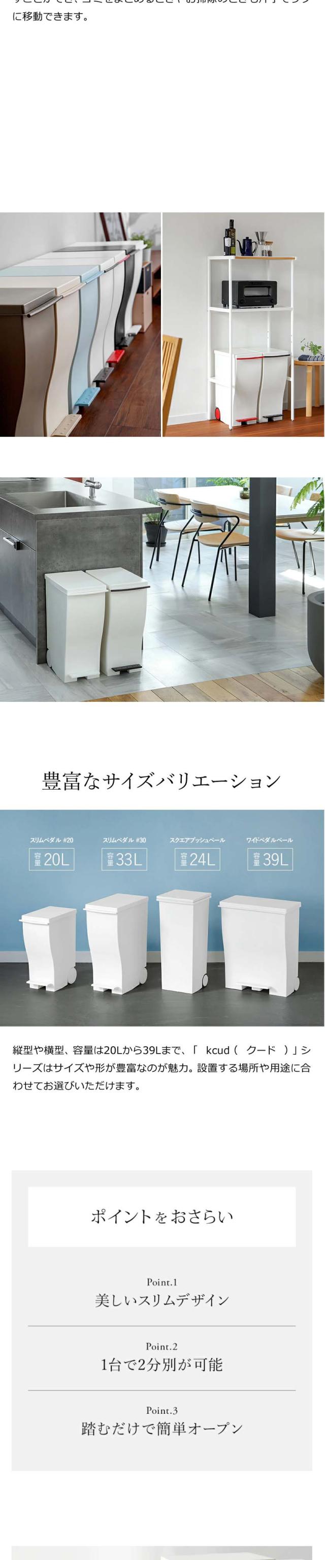 ゆるやかな曲線とシャープな直線のフォルムが美しい、縦型の日本製ダストボックス『 kcud( クード )スリムペダル #30 』。両手がふさがっていても使いやすいペダル式ゴミ箱です。上に向かって広がっているのでゴミ袋を取り出しやすく、キャスター付きで移動もスムーズ。45Lのポリ袋対応で、取っ手付きポリ袋をセットすれば1台で2分別も可能。複数並べても圧迫感のない、スマートシンプルなデザインです。