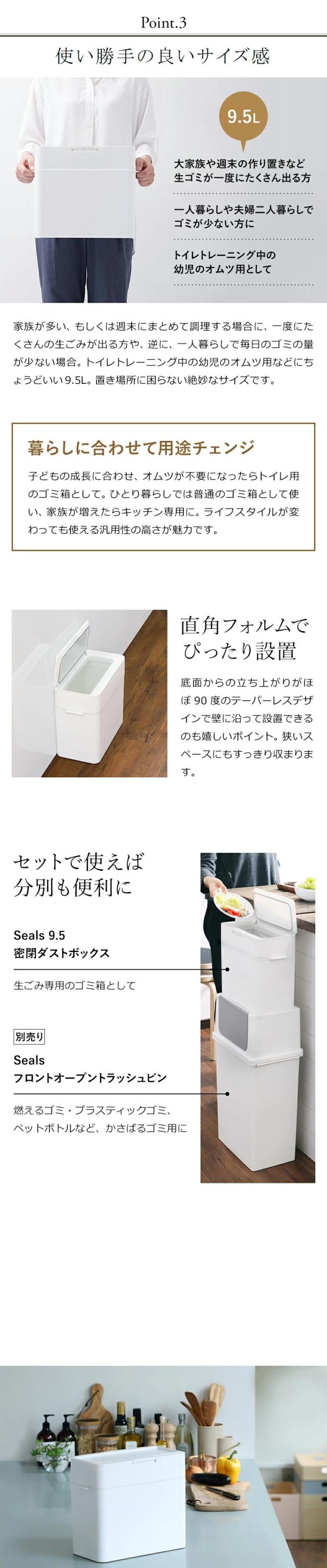 生ごみや使用済みのオムツなど気になるゴミのニオイ漏れを防いでくれるフタ付きのゴミ箱『 Seals( シールズ )9.5 密閉ダストボックス 』。フタの内側に付いているシリコンパッキンがニオイの漏れを防いでくれるすぐれもの。リビングやキッチンに置いていてもニオイが漂ってくる心配を軽減してくれます。開口部はフタを軽くワンプッシュすれば大きくオープン。料理中など片手がふさがっていてもラクに開けられ、ゴミをサッとに捨てることができます。めんどうなゴミ袋の交換も、手間がかからずスムーズに行える仕掛けも◎。