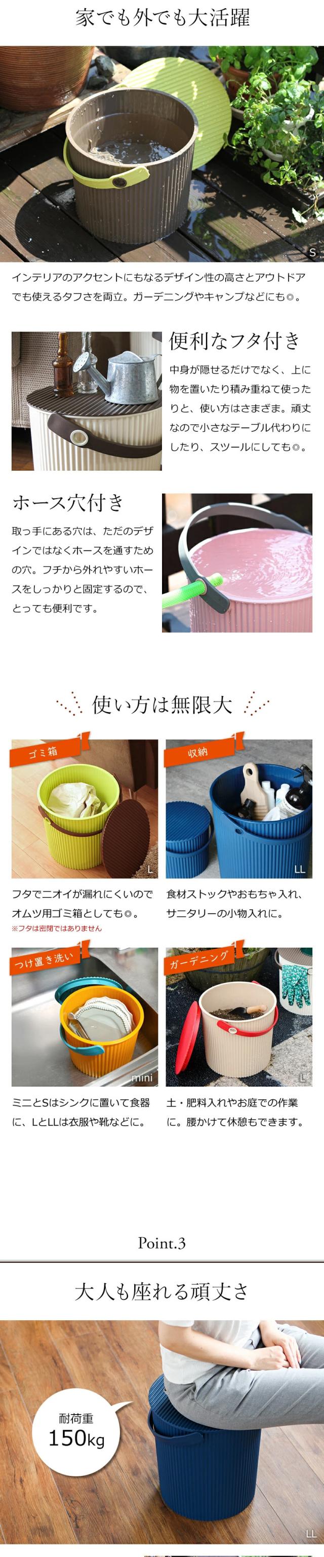 収納BOX、ランドリーバスケット、野菜ストッカー、おもちゃ箱など、使い方自由なオシャレなバケツ。オムツ入れやおむつカバーのつけ置きなどにもOK。ギフトにも是非♪