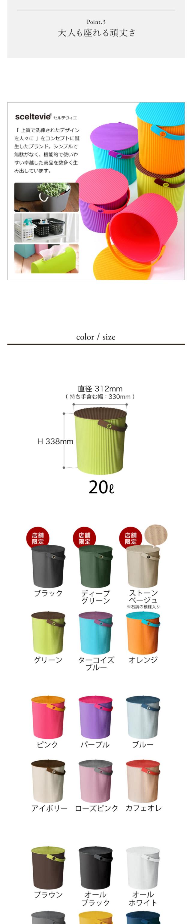カラフルなフタ付きバケツ『 セルテヴィエ オムニウッティ LL 』。収納物がたっぷりと入るビッグサイズです。キュートな見た目とは裏腹に、耐荷重はなんと驚きの150kg。フタをしてスツールやオットマンとしても◎。おうちの中でも外でも使いたくなるおしゃれなバケツです。