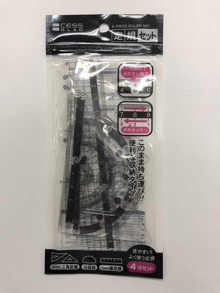 定規セット 直定規・三角定規(2種)・分度器 4個入 ジップパック付 (100円ショップ 100円均一 100均一 100均)