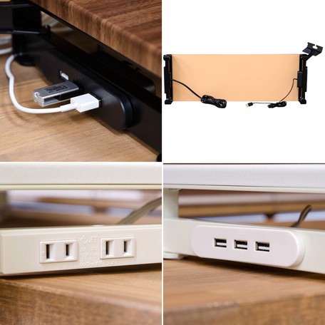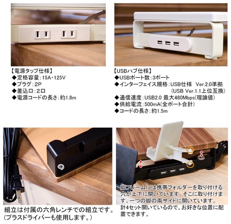 USBポート、電源タップ、携帯フォルダーがついているモニタースタンドです。