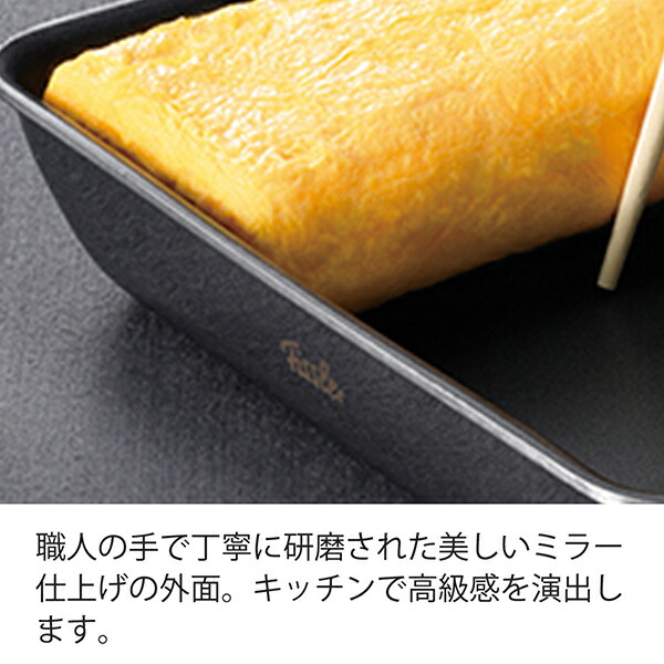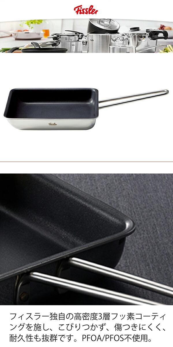 細部に職人技が光る日本製の逸品。クオリティを追求し続けるフィスラーの自信作です。 ■高密度3層フッ素コーティング フィスラー独自の高密度3層フッ素コーティングを施し、こびりつかず、傷つきにくく、耐久性も抜群です。また、人体や環境に有害とされるPFOA/PFOSは一切使用していません。 ■4層クラッド構造 本体は蓄熱性の高いステンレスと熱伝導性に優れたアルミニウムの全面4層クラッド構造で、熱ムラなく、玉子焼きがふっくらきれいに仕上がります。 ■美味しくきれいな玉子焼きが焼ける計算された形状 高度な成型技術によって生み出された、鍋の内側の滑らかなカーブ形状で、どなたでも簡単にプロのようなふっくら美味しくきれいな玉子焼きが仕上げられます。 ■日本の技術が光る美しいミラー仕上げ 職人の手で丁寧に研磨された美しいミラー仕上げの外面。キッチンで高級感を演出します。 ■使い勝手の良いワイヤーハンドル ステンレス製のワイヤーハンドルは、丈夫で衛生的。キッチンのフックにかけやすい形状もポイントです。 |