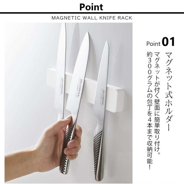 使いたい包丁がサッと手に取りやすく、収納できるマグネット式の包丁ホルダー。マグネットが付く壁面に簡単取り付け。