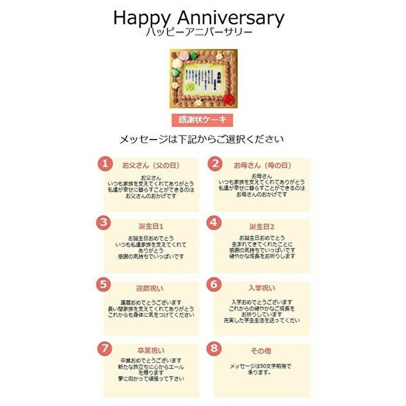 【ご注文の流れ】ご注文時にケーキのクリーム、賞状の表題、お名前の敬称、文章のご希望を選択頂き、ご購入手続きの際に「その他要望」→「変更」をクリック、ご希望内容をご入力下さい。お届けご希望日の7営業日前(定休日・夏季、12月、年末年始休業除く)までにご希望の表題、文章、名入れのご連絡をお願いしております。