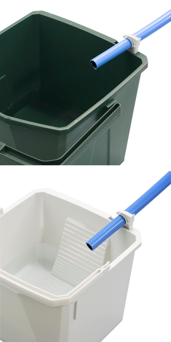 本体と中バケツには簡単差し込みタイプのホース止めが付います。水を溜める際などにホースが固定でき大変便利です。
