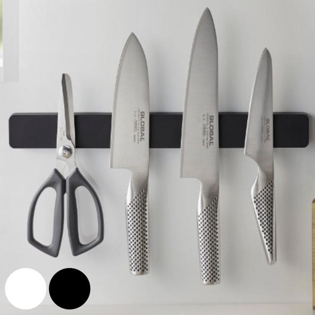 使いたい包丁がサッと手に取りやすく収納できるマグネット式の包丁ホルダーです。ハサミ、計量スプーン、ナイフなど、たっぷり収納でき、調理中にサッと手にとれて、使った後もすぐに戻せるので作業がはかどります。マグネットがつく壁面ならピタッと貼るだけでOK。いつでも手軽に取り付け・取り外しができます。また、付属の木ネジ・壁面用粘着テープを使えば、鉄壁面以外にも取り付け可能です。