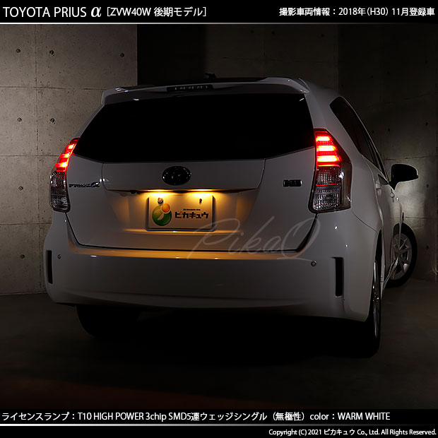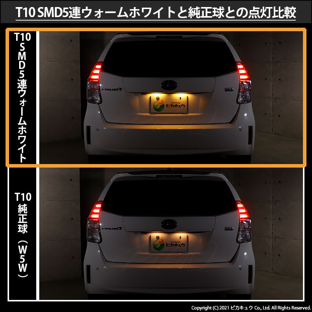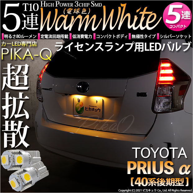 ピカキュウ,LED専門店,LEDバルブ,LED,SMD,T10,W5W,T10 HIGH POWER 3CHIP SMD 5連ウェッジシングル球,ウォームホワイト(電球色),ライセンスランプ,番号灯,トヨタ,40系プリウスアルファ,プリウスα,TOYOTA,PRIUSα,ZVW40W,ZVW41W,後期
