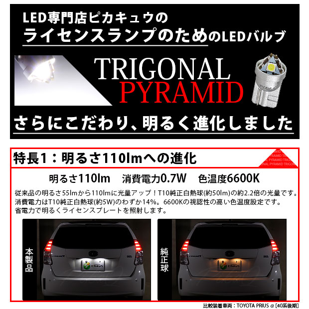 トヨタ プリウスα (40系 後期) 対応 LED ライセンスランプ トライアングル ピラミッド バルブ T10 SMD ホワイト 6600K 110lm 2個 3-C-4