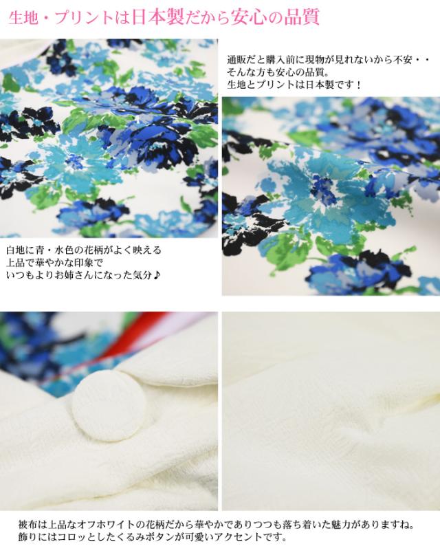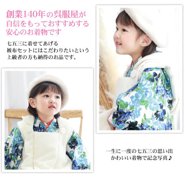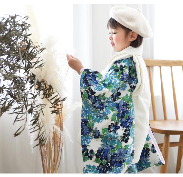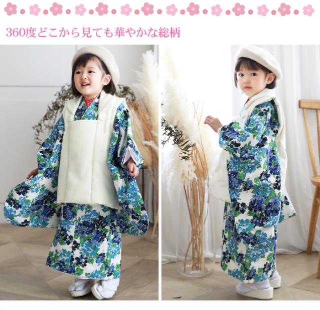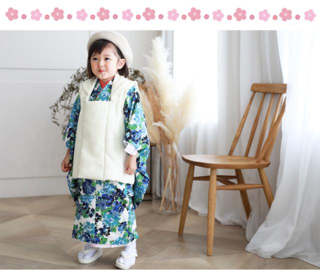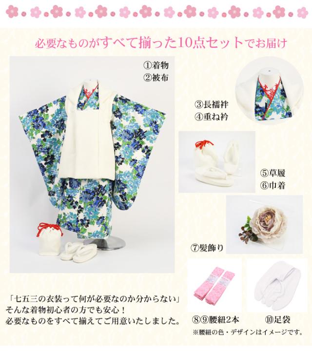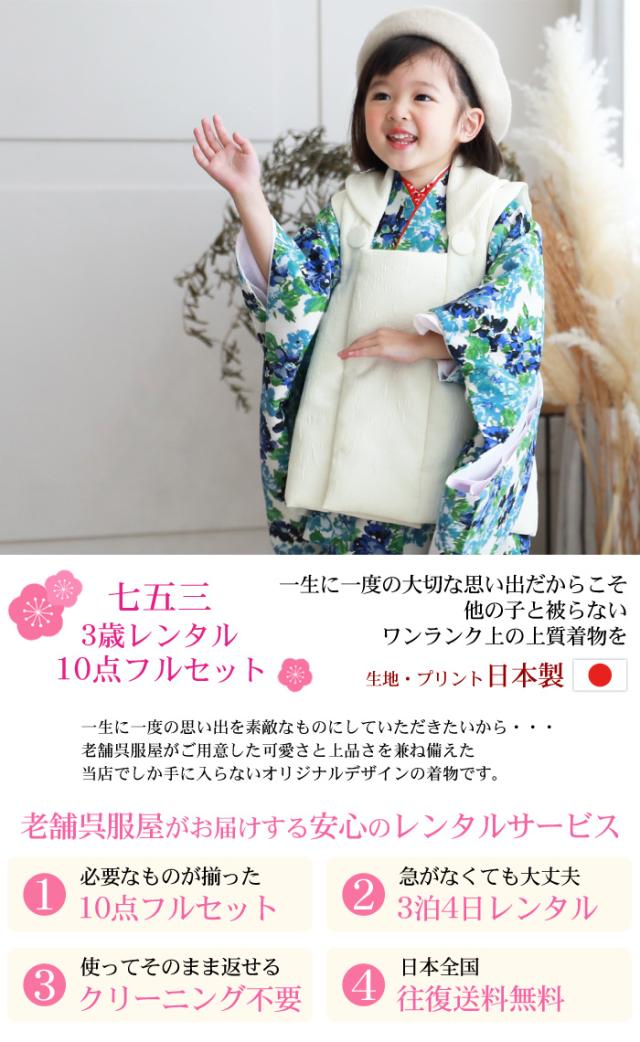 【レンタル】当店オリジナル 七五三 着物 3歳 レンタル 女の子 被布着物10点セット「白地に青・水色の花柄・被布白」日本製生地・着物被布セット モダン 衣装 おしゃれ かわいい