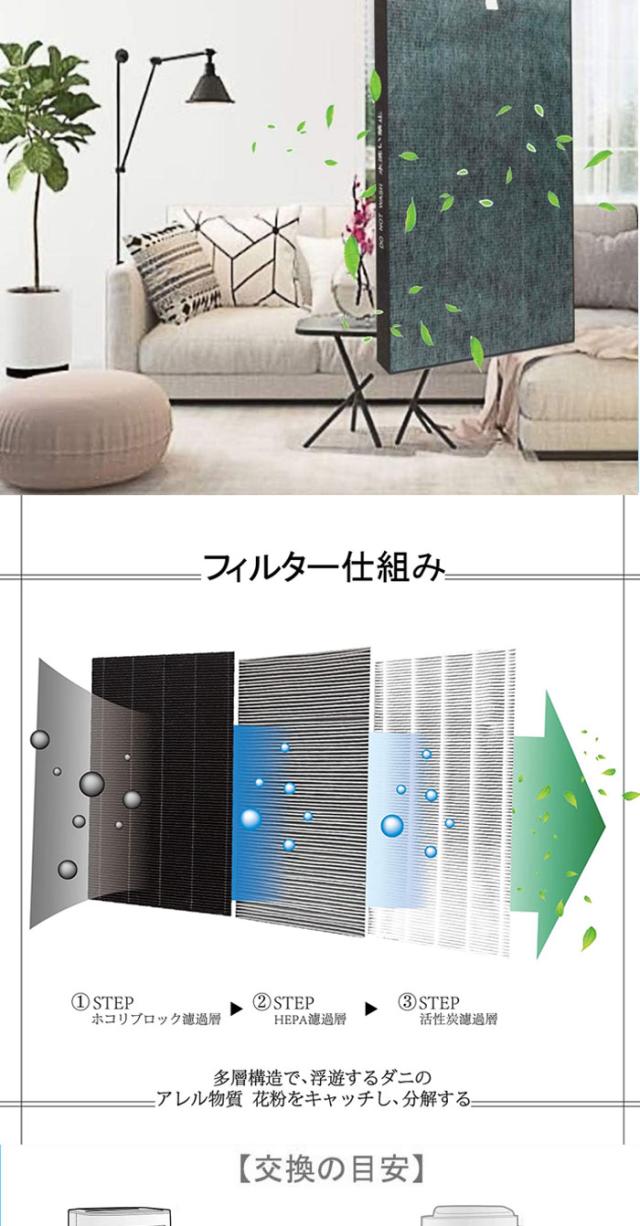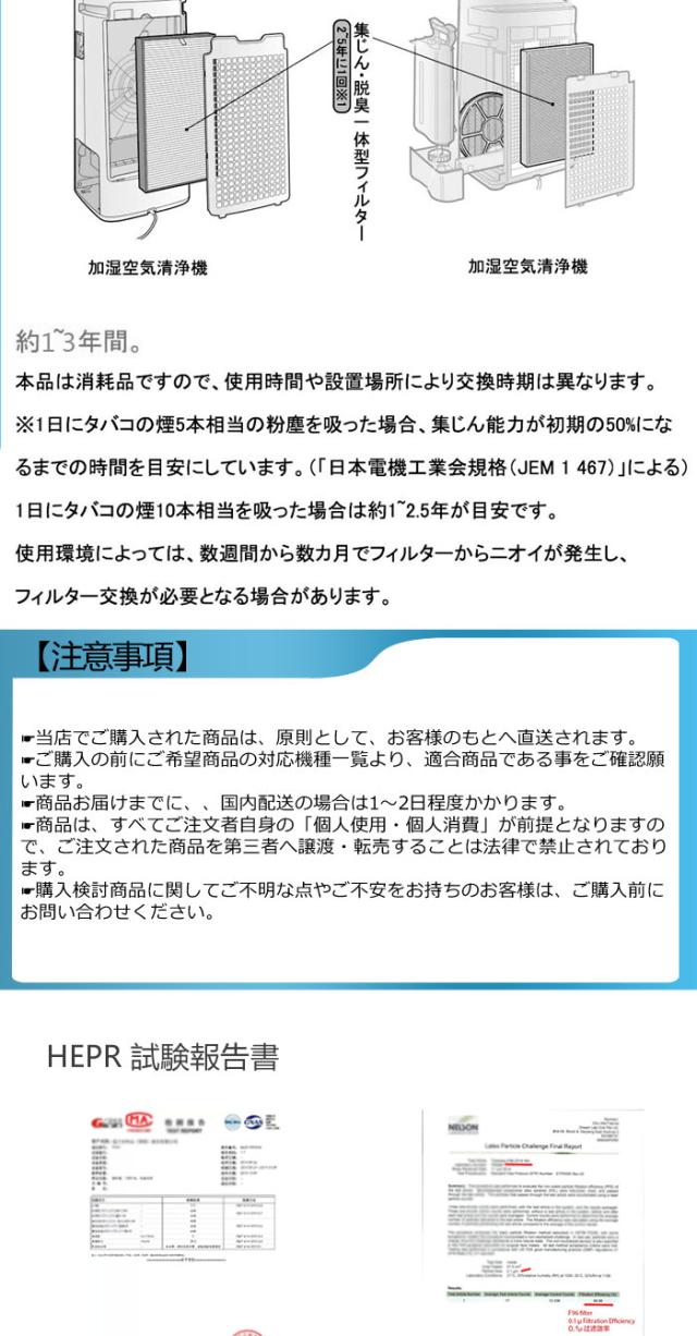 ● シャープ加湿空気清浄機 交換用集じんフィルター 制菌HEPAフィルター 対応型番: FZ-W65HF「互換品」● フィルター機能: 抗アレル物質・抗ウイルス(集塵・制菌HEPAフィルター)は、0.3μmのホコリを99.97%以上集じんできるHEPAフィルターで、花粉(99.9%除去)やダニ(99.8%除去)などのアレル物質やウイルス(99.9%除去)の活動も抑えます。● お部屋の細かい粉じんやホコリを集めるため変色(灰色、黄土色など)することがありますが、異常ではありません。● 集塵フィルター交換の目安:約3~5年。一般家庭で1日タバコ10本吸った場合(使用時間や設置場所により交換時期は異なります)。● 本品は消耗品です。使用環境によりフィルターの寿命が変化するため注意が必要。汚れが目立ち効果が落ちているようでしたら、速やかに交換することをおすすめいたします。