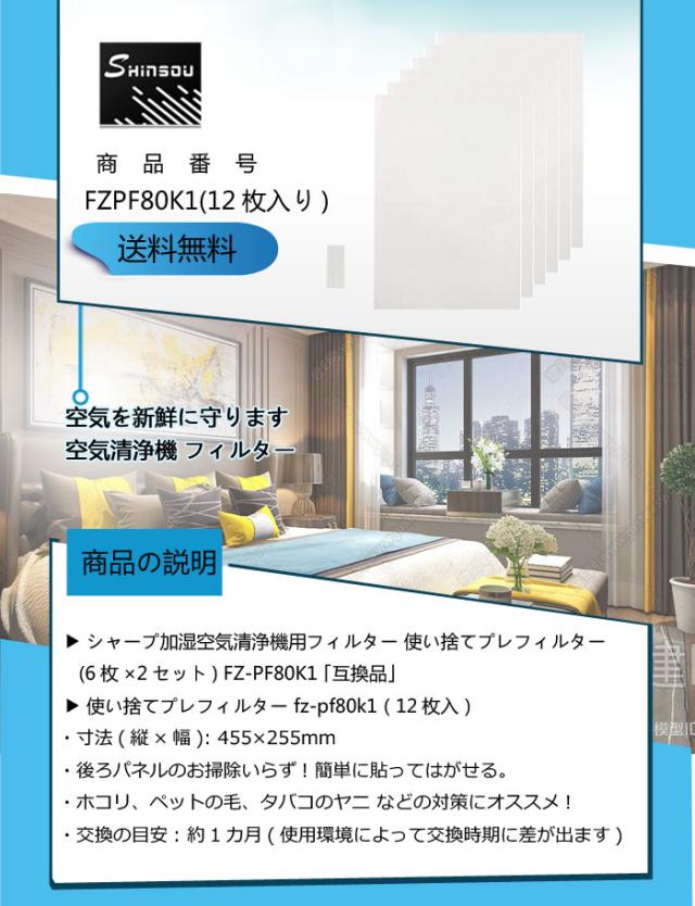 シャープ加湿空気清浄機用フィルター 使い捨てプレフィルター (6枚×2セット) FZ-PF80K1 「互換品」