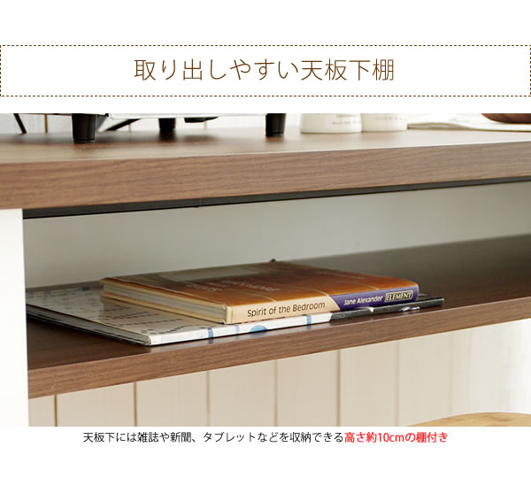 天板下には棚、側面にはラックがあり収納力もたっぷり♪キッチンで活躍まちがいなしです。さらに天板には2個口コンセント付きで使い勝手バツグン!