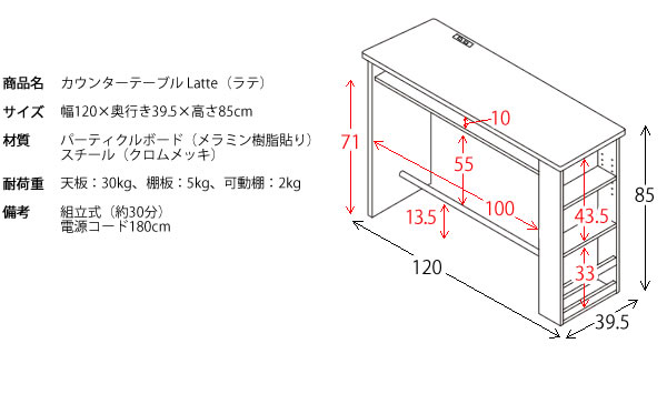 カウンターテーブル キッチンカウンター デスク ハイカウンター レンジ台 間仕切り カウンター 調理台 ハイタイプ スタンディングカウンター キッチン収納 作業台 コンセント付き スリム設計 幅120高さ85cm カウンターテーブル Latte(ラテ)