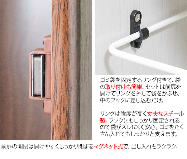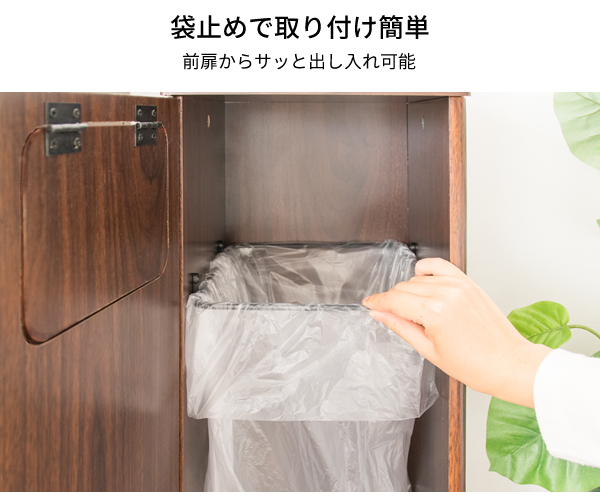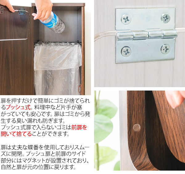 臭いが漏れにくく押すだけで簡単に捨てられるプッシュ扉式。ゴミ袋の着脱も簡単な前扉があり、利便性もバツグンです。