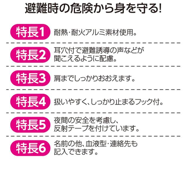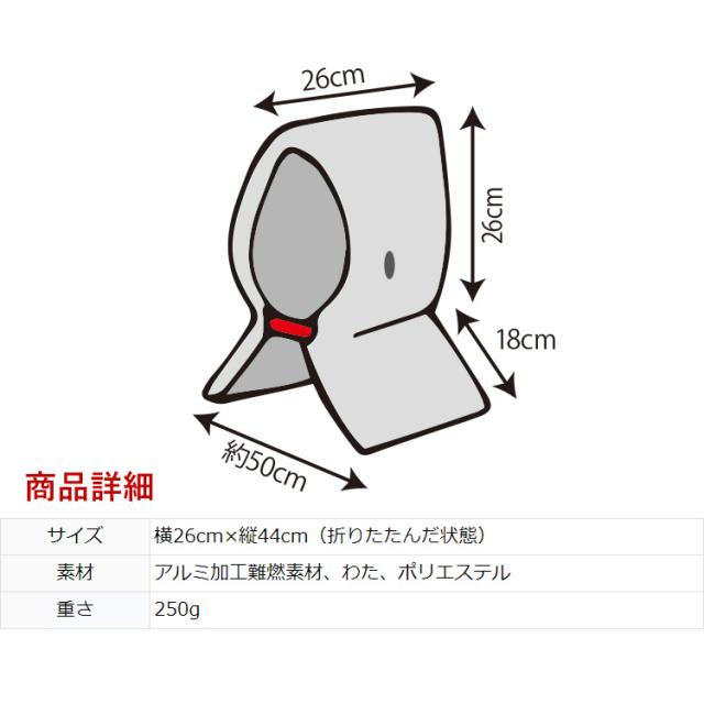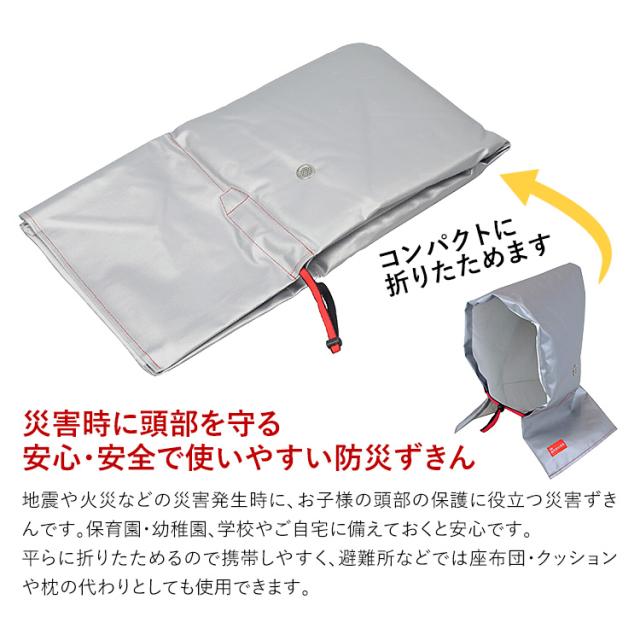 ・地震や火災などの災害発生時に、お子様の頭部の保護に役立つ災害ずきんです。保育園・幼稚園、学校やご自宅に備えておくと安心です。平らに折りたためるので携帯しやすく、避難所などでは座布団・クッションや枕の代わりとしても使用できます。