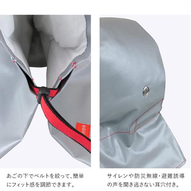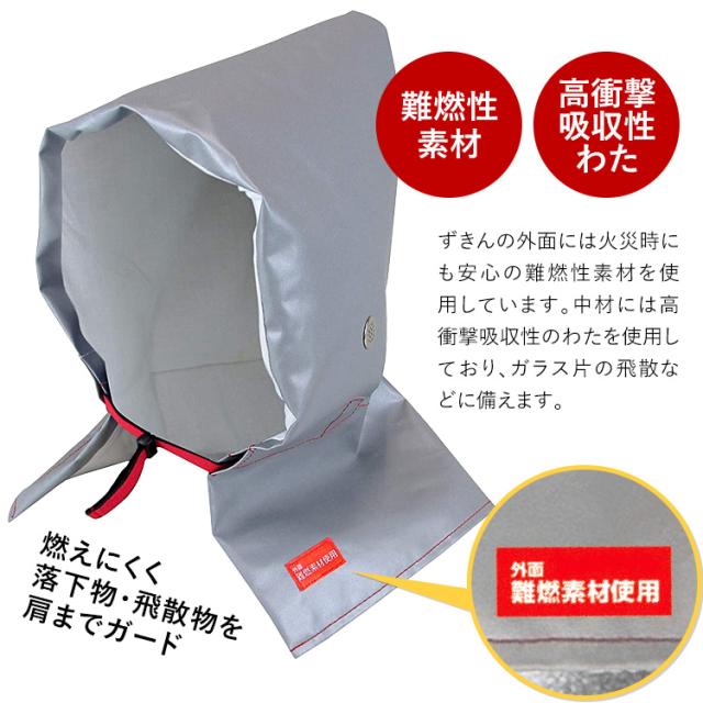 ・ずきんの外面には火災時にも安心の難燃性素材を使用しています。中材には高衝撃吸収性のわたを使用しており、ガラス片の飛散などに備えます。