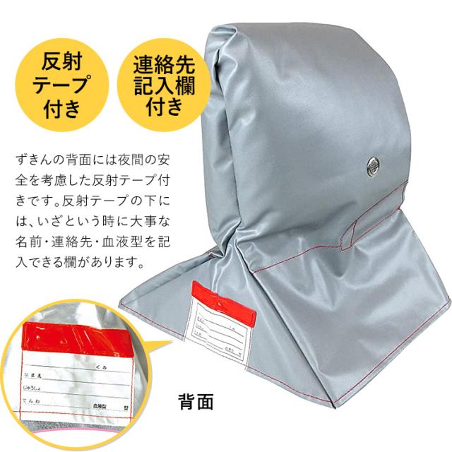 ・ずきんの背面には夜間の安全を考慮した反射テープ付きです。反射テープの下には、いざという時に大事な名前・連絡先・血液型を記入できる欄があります。