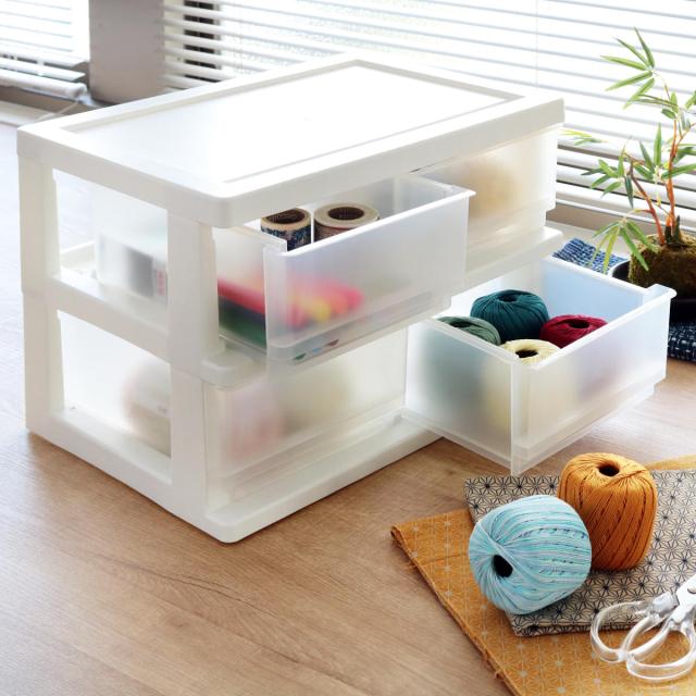 4つあるハーフサイズの引き出しは、オフィスやおうちのデスク周り、趣味の道具や材料の整理にもピッタリです。用途別、種類別に収納したい時に活躍します。