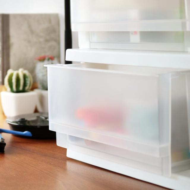 引き出し部分の表面はシボ加工が施してあるので、高級感のあるデザインです。見えやすいけど見え過ぎない半透明なので見た目もスッキリ、外から中身の確認もしやすいです。