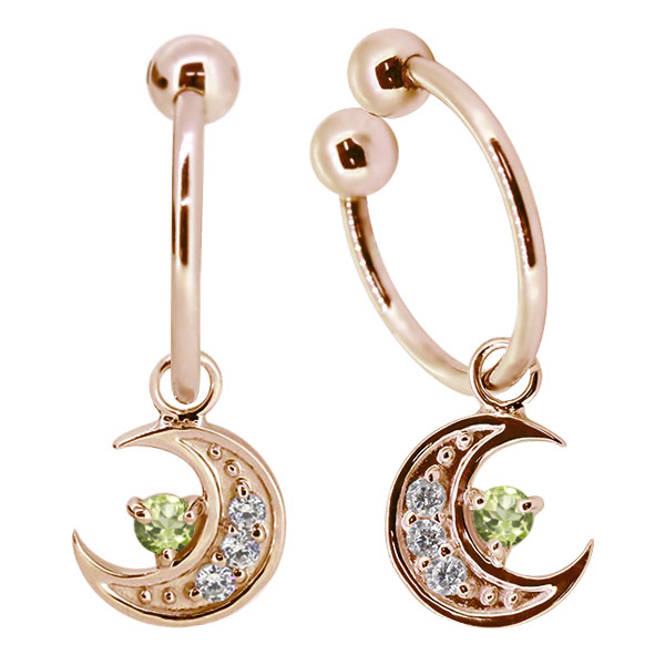 イヤリング 月 揺れる ペリドット 8月誕生石 三日月 フープ ノンホールピアス 10k 両耳用