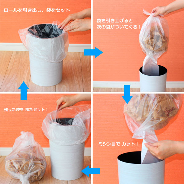 つながったままゴミ箱にかけて使用する袋で、取り替え時に新しいゴミ袋を用意しなくていいのでラクラクです。