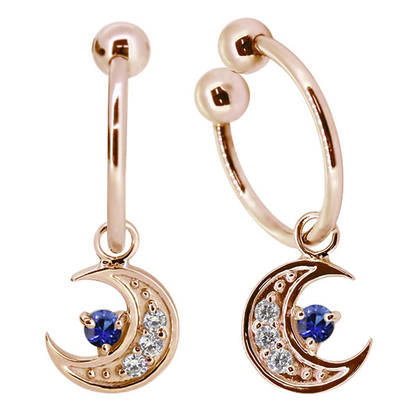 イヤリング 月 揺れる サファイア 9月誕生石 三日月 フープ ノンホールピアス 10k 両耳用