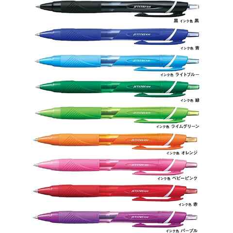 ストア内の商品は全品送料無料です。超・低摩擦ジェットストリームインク搭載。あざやかなインク色で、ノートの色分けなどに最適です。ジェットストリーム カラーインク 0.7mm 全9色インク色:黒・青・ライトブルー・緑・ライムグリーン・オレンジ・ベビーピンク・赤・パープル■メーカー: 三菱鉛筆