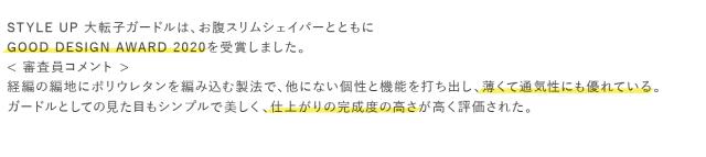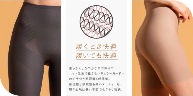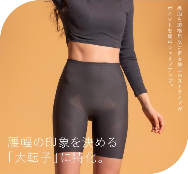 「大転子」とは、骨盤と太もものつなぎ目部分。下半身が一番広がるポイントです。大転子ガードルは、これまでのガードルに無い「やわらかさ」と「軽さ」でまるで履いていないような解放感を味わえる独特の製法が特長。重さもなんとレギュラータイプの約半分の超軽量!縫い目を最小限に減らしたシームレス構造で、ヌーディな素肌感を実現しました。それでいて、表面を縦横無尽に走る強圧のストライプが、キーポイントを集中シェイプアップ。
