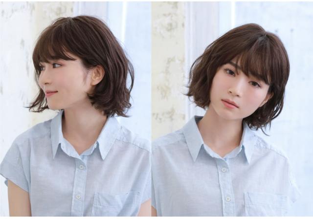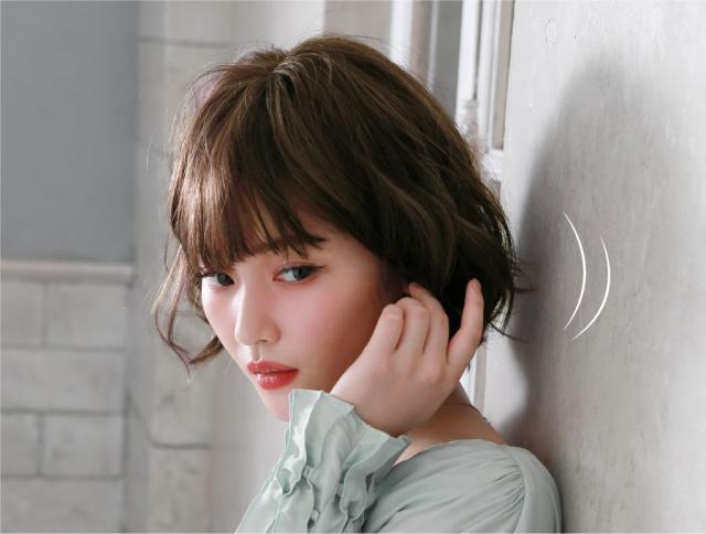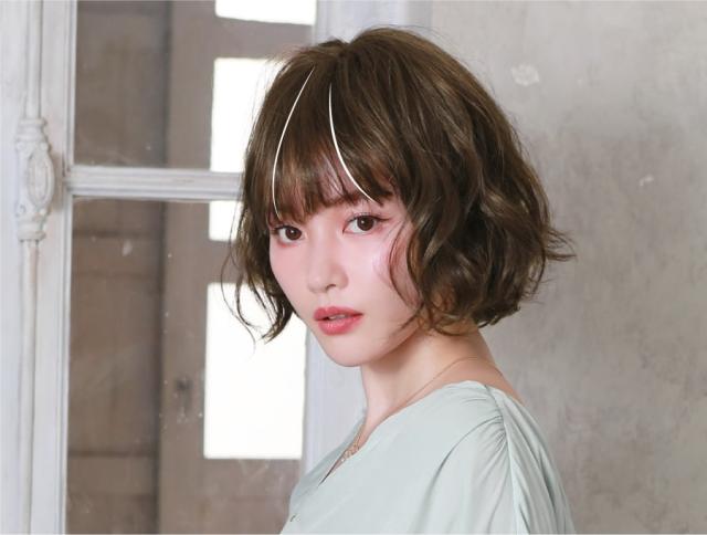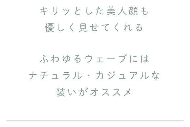 クセ毛風パーマのような柔らかいウェーブ感は、毛先がランダムに遊び、軽やかな印象です。前髪はアイロンで軽く巻いたようにふんわり。