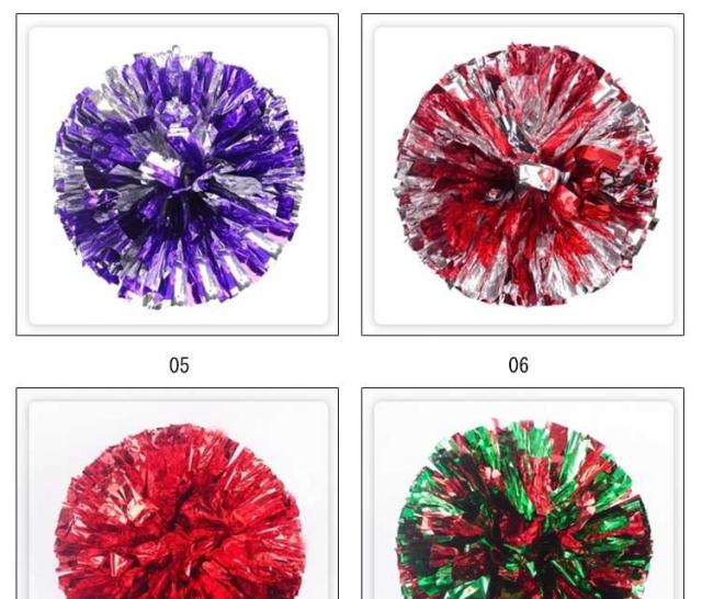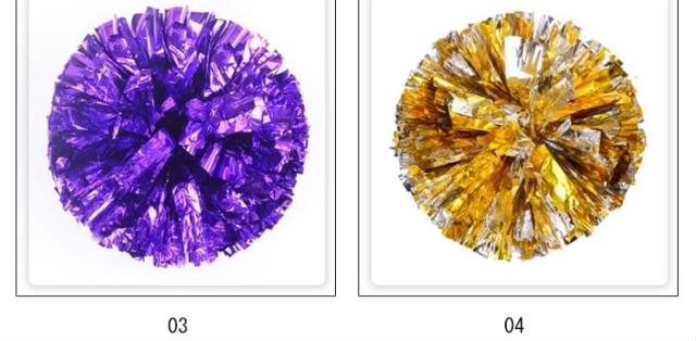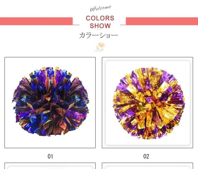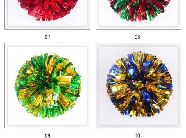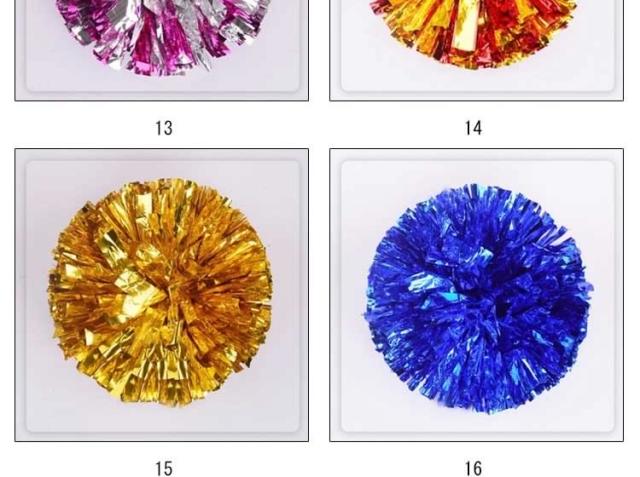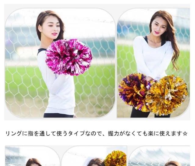 | キラキラでメタリックなポンポンです☆幅広のキラキラがとっても華やか!チアダンスの小道具にピッタリなアイテム☆リングに指を通して使うタイプなので、握力がなくても楽に使えます☆運動会で踊るダンスの小道具、コンサート、応援グッズとしてもオススメです☆ | |