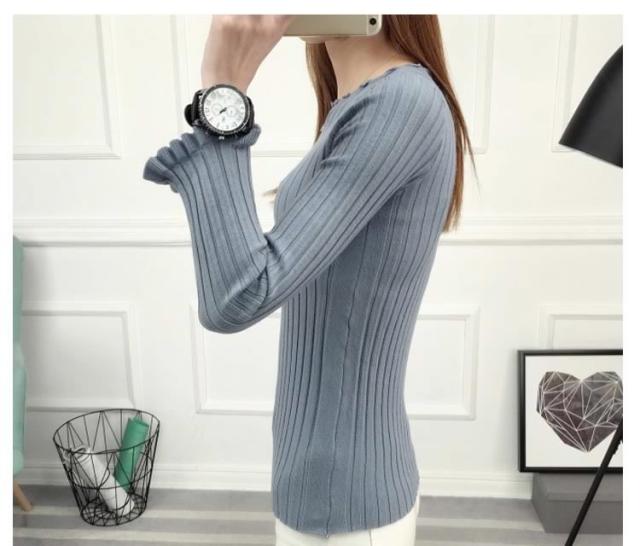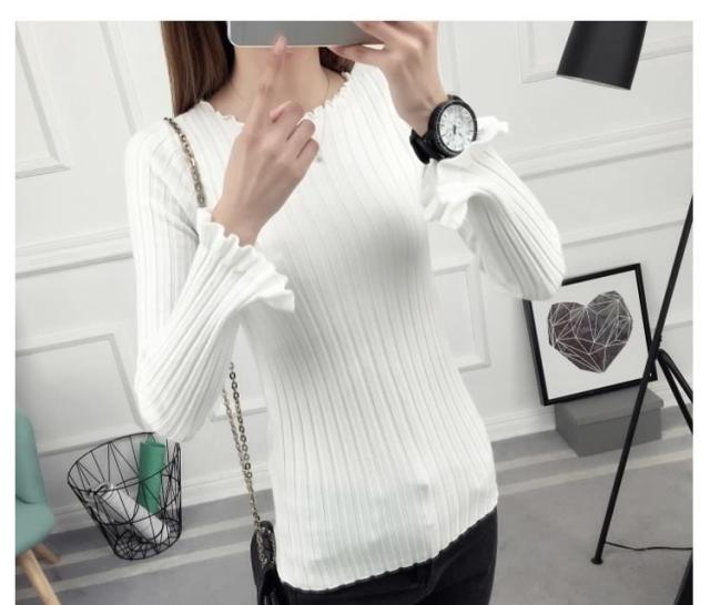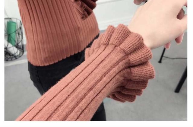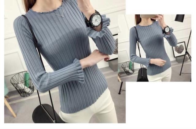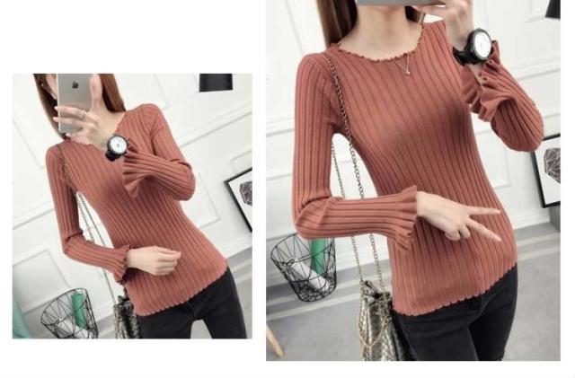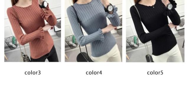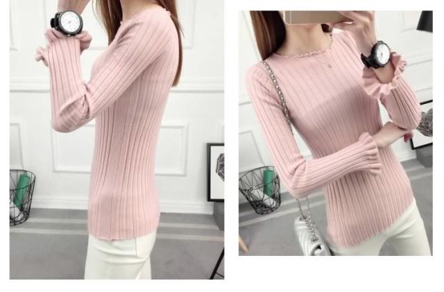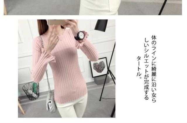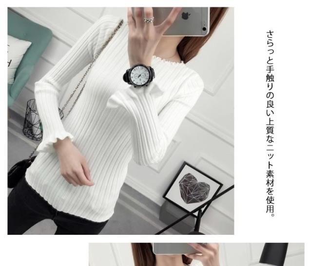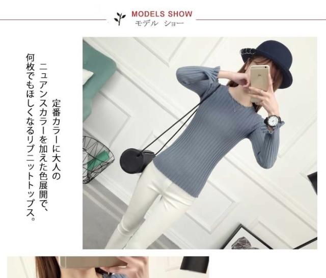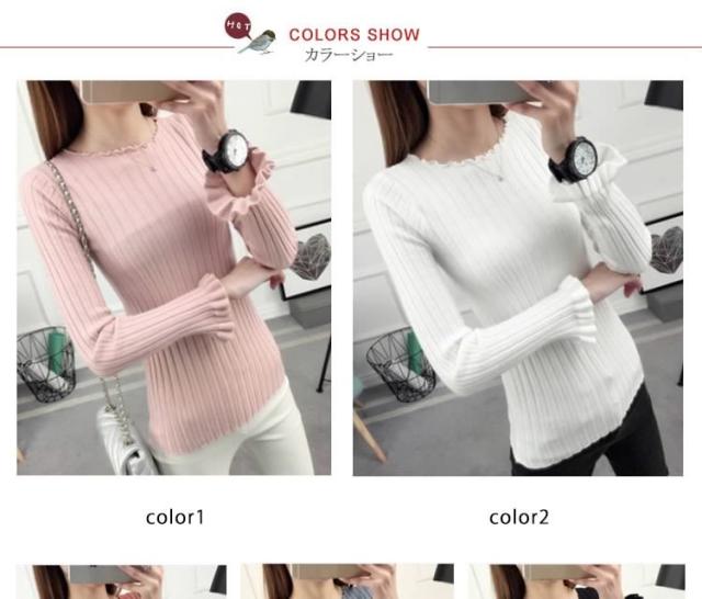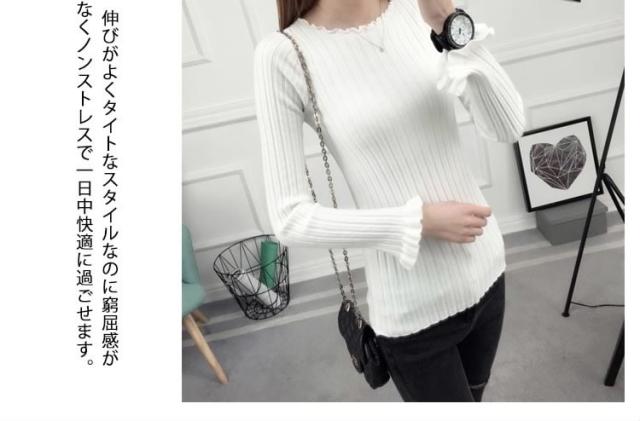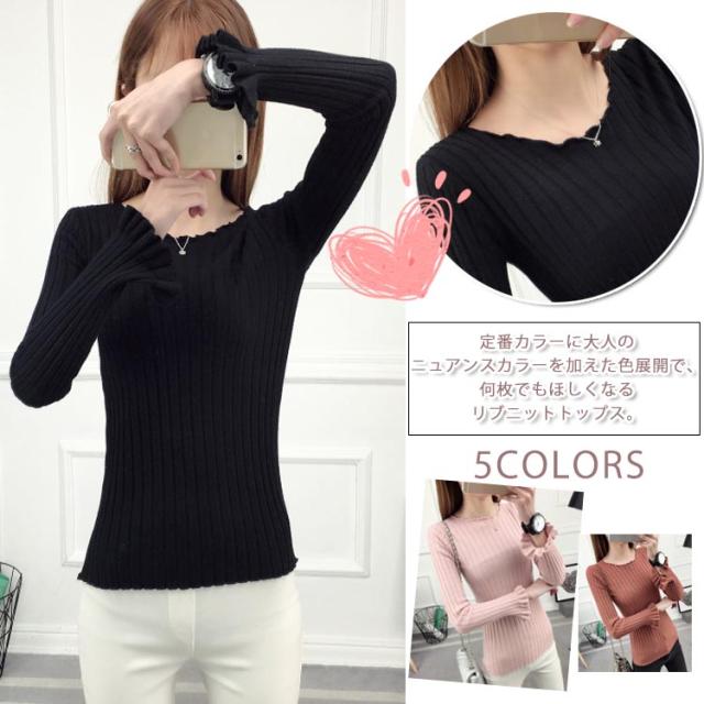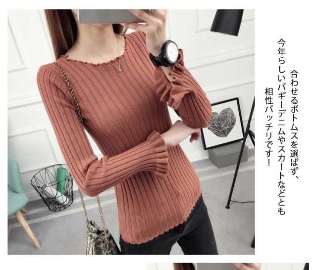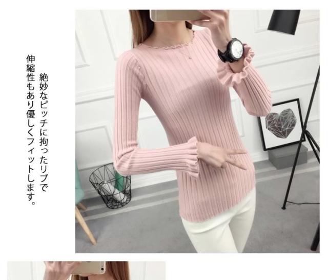 シンプル無地だから万能。ストレッチ リブニット レディース ニットトップス 長袖 フリル ラウンドネック 無地