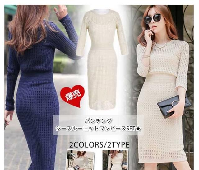 ニットワンピース+キャミソール 2点セット パンチング