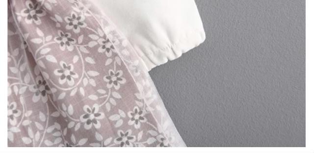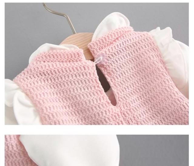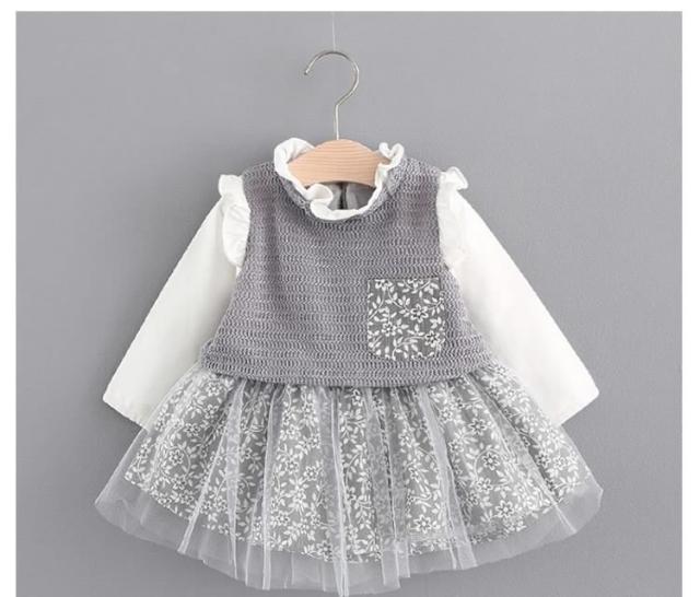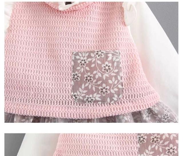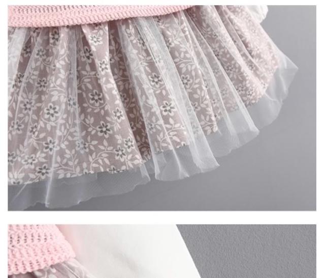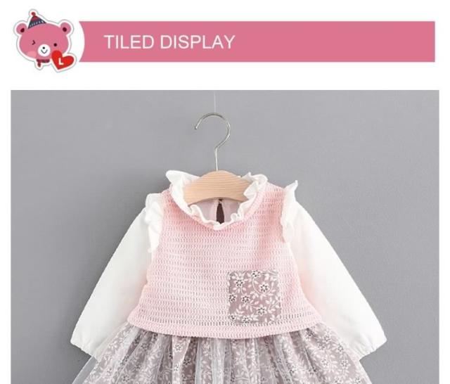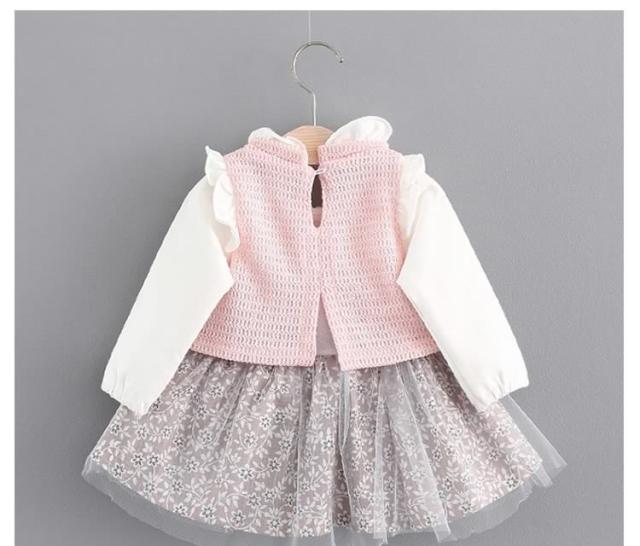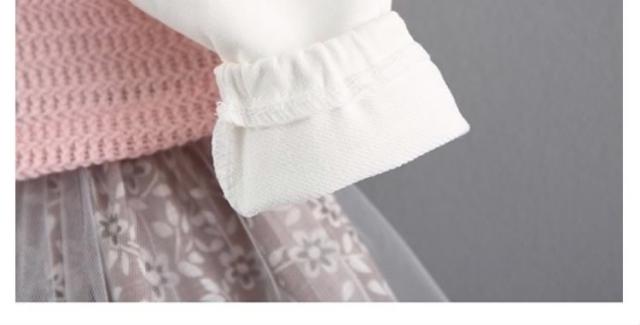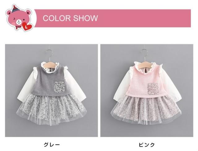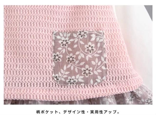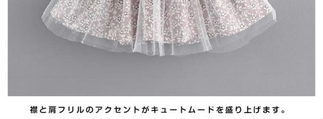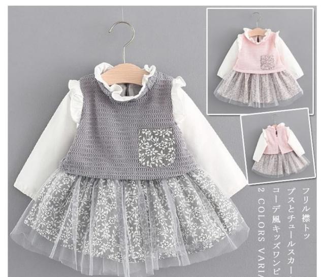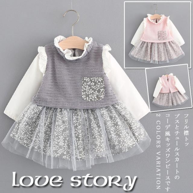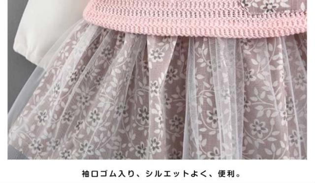 フリル襟トップスとチュールスカートのコーデ風キッズワンピース 女の子長袖ワンピース 花柄 ポケット 活発 カジュアル スイート