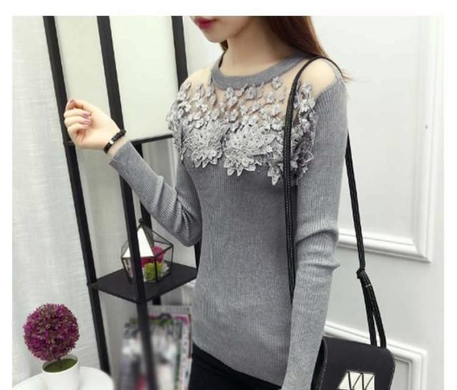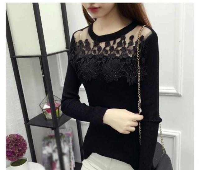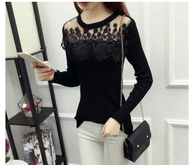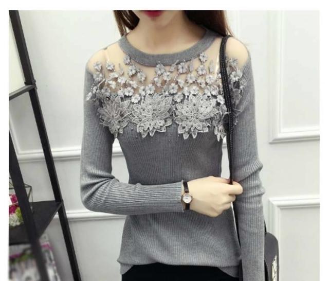 ニット トップス 刺繍 花柄 花柄刺繍 リブニット リブ素材 タイト レース シースルー 細見せ シンプル HS レディース 黒 赤 灰色 ブラック グレー ワインレッド レッド バーガンディー