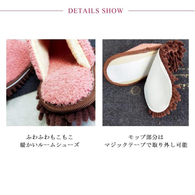 | 一石二鳥!履くだけでお掃除しちゃう♪ 履いて歩くだけで掃除ができるモップスリッパ、家事をしながら家中ピカピカ! ふわふわもこもこのモップスリッパ、暖かくて履き心地GOOD! マイクロファイバーモップ付で、水滴、髪の毛、ほこり、ちりなどをすばやくキャッチ! フローリングに優しい柔らいふわもこ素材、床の音対策にも◎ モップはマジックテープで取り外しできるから、モップのみ洗えるのも魅力的。 大きいサイズまで展開、男女問わずご着用いただけるスタイリッシュな無地デザインも嬉しいポイント。 | |