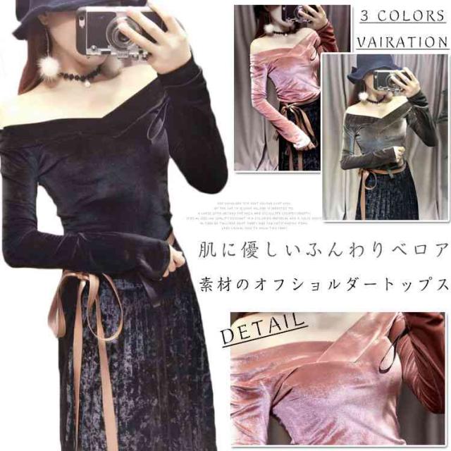 光沢感のあるベロア素材で上品!オフショルダーTシャツ トップス Vネック Tシャツ カットソー オフショルダー セクシー 長袖 秋冬 ベロア レディース おしゃれ