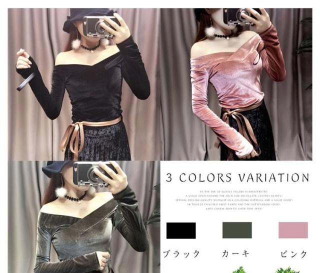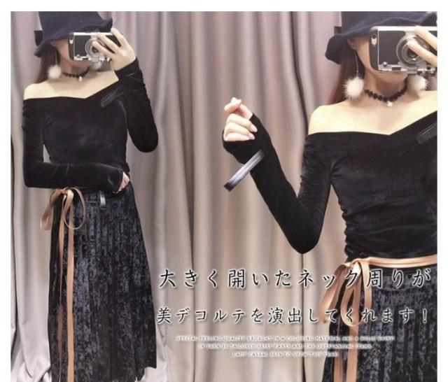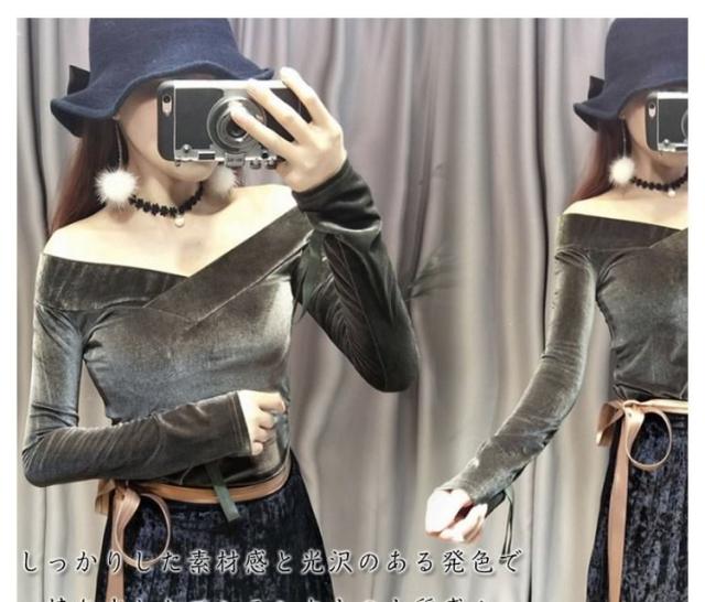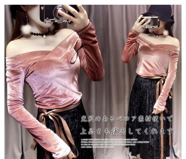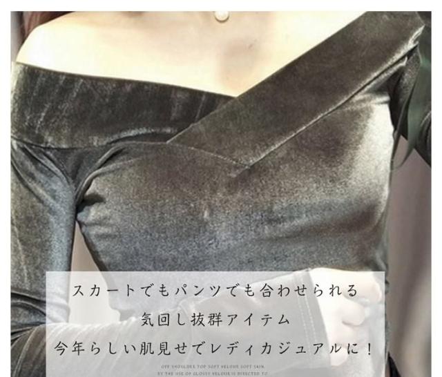 光沢感のあるベロア素材で上品!オフショルダーTシャツ トップス Vネック Tシャツ カットソー オフショルダー セクシー 長袖