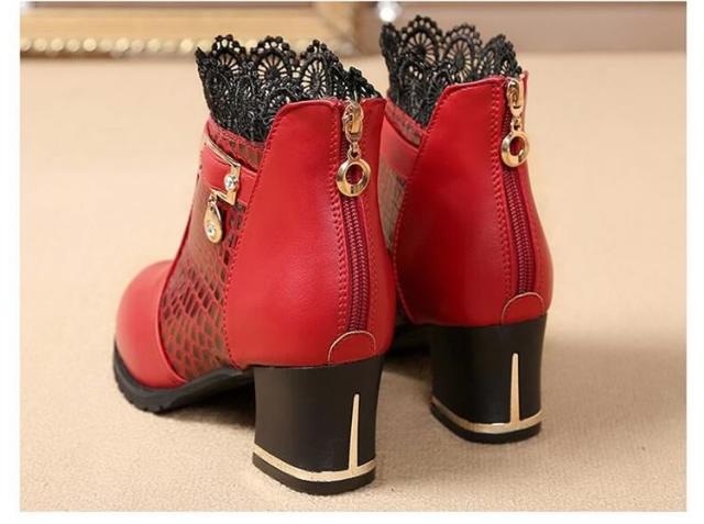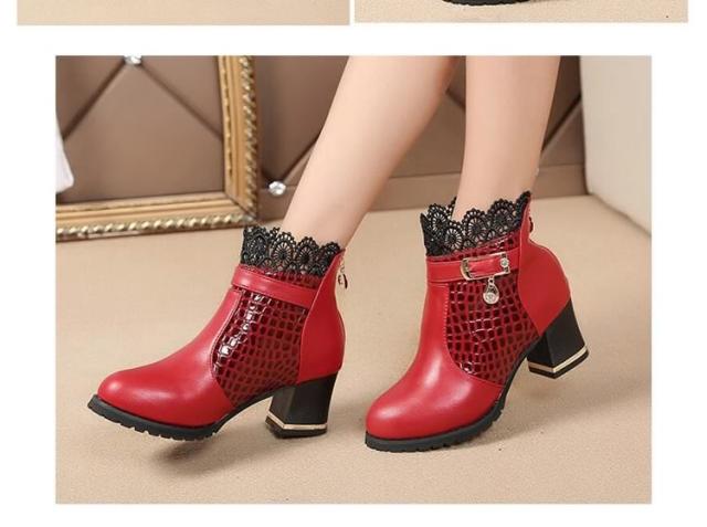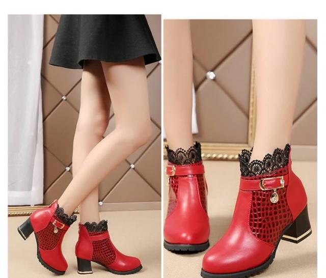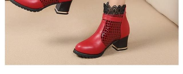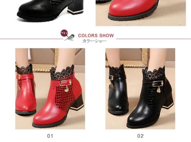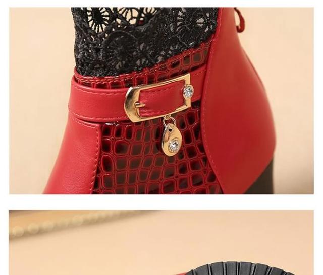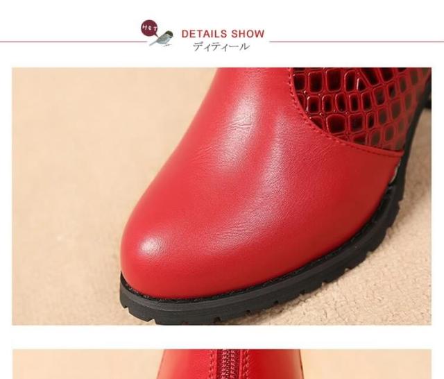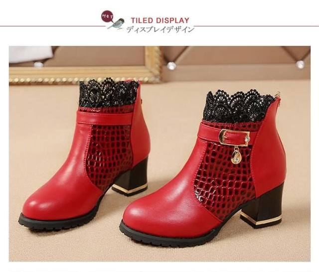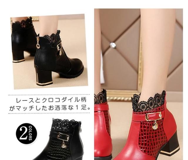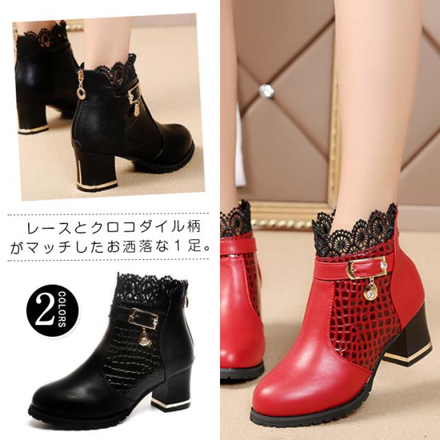 ブーツ ショートブーツ レース クロコダイル柄 ベルト チャーム ミドルヒール クロコダイル チャンキーヒール レディース 靴 シューズ 黒 ブラック 赤 レッド 22.5cm 23cm 23.5cm 24cm 24.5cm