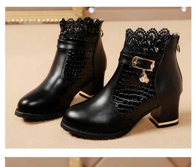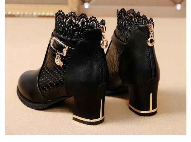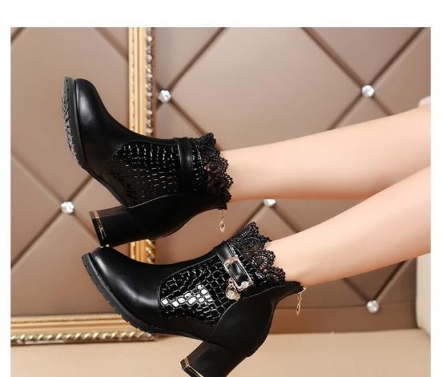 ブーツ ショートブーツ レース クロコダイル柄 ベルト チャーム ミドルヒール クロコダイル チャンキーヒール レディース 新作
