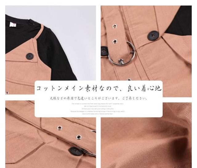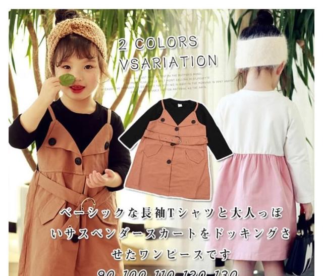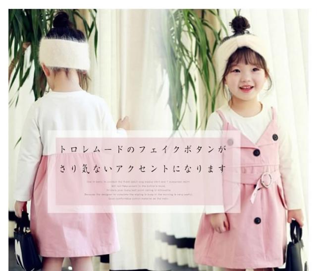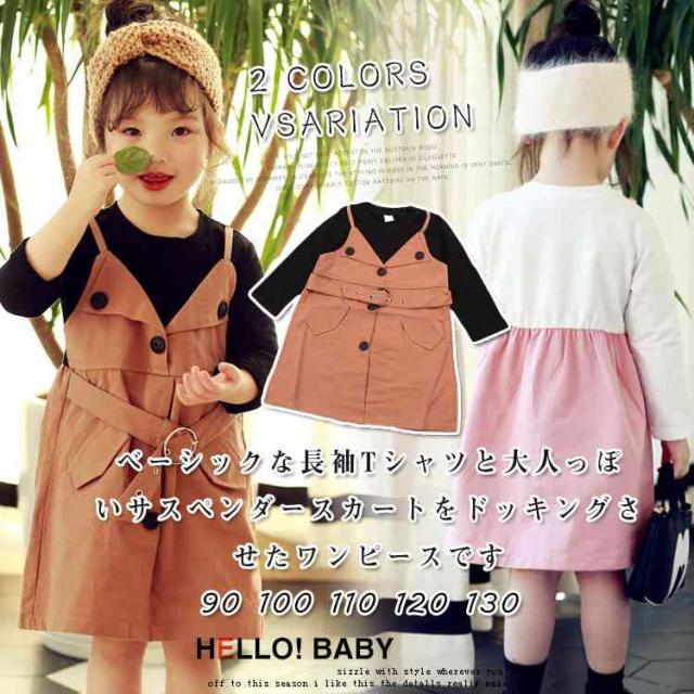 ベーシックな長袖Tシャツと大人っぽいサスペンダースカートをドッキングさせたワンピース 女の子ワンピース 子供服 長袖 フェイクレ