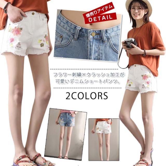 フラワー刺繍×クラッシュ加工が可愛い!フラワー刺繍 クラッシュ ショートパンツ デニムショートパンツ 刺繍ショートパンツ デニム