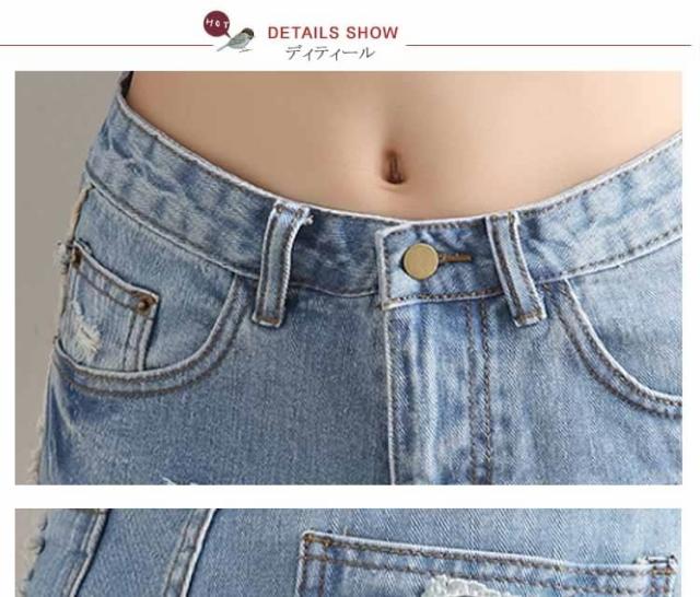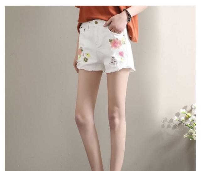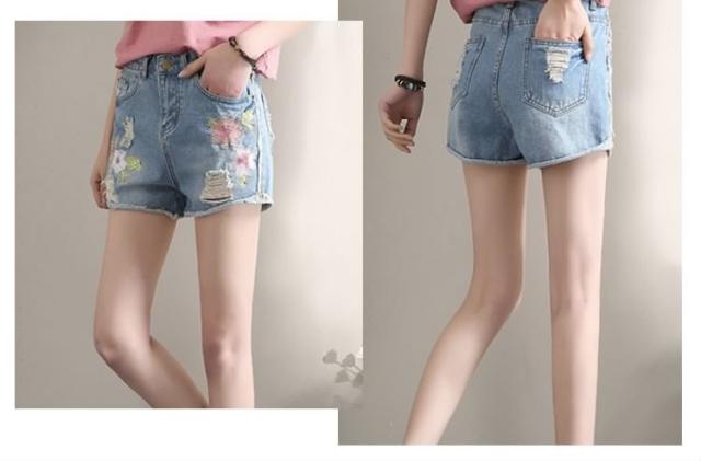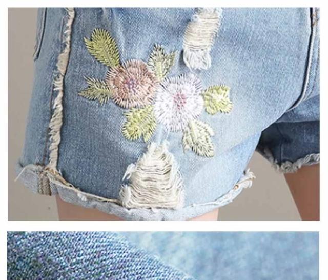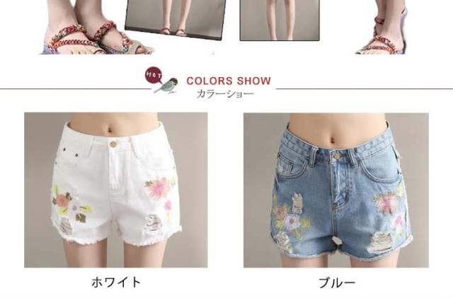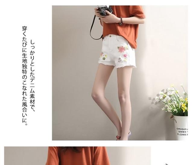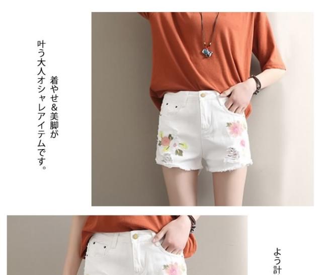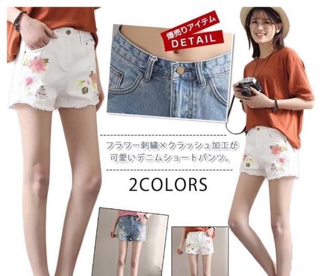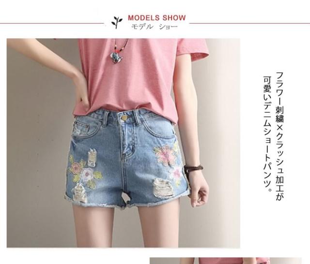 今季トレンド!フラワー刺繍 デニムショートパンツ クラッシュ ダメージ ショートパンツ