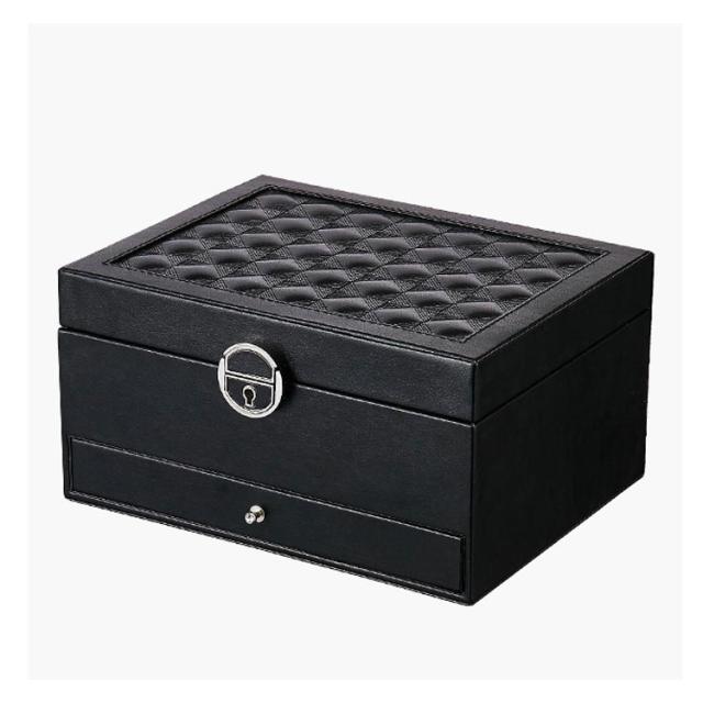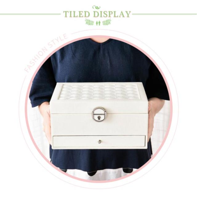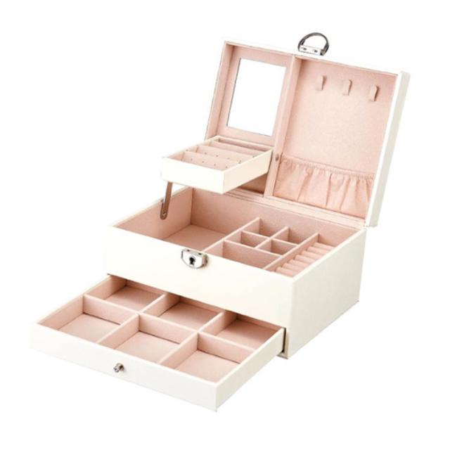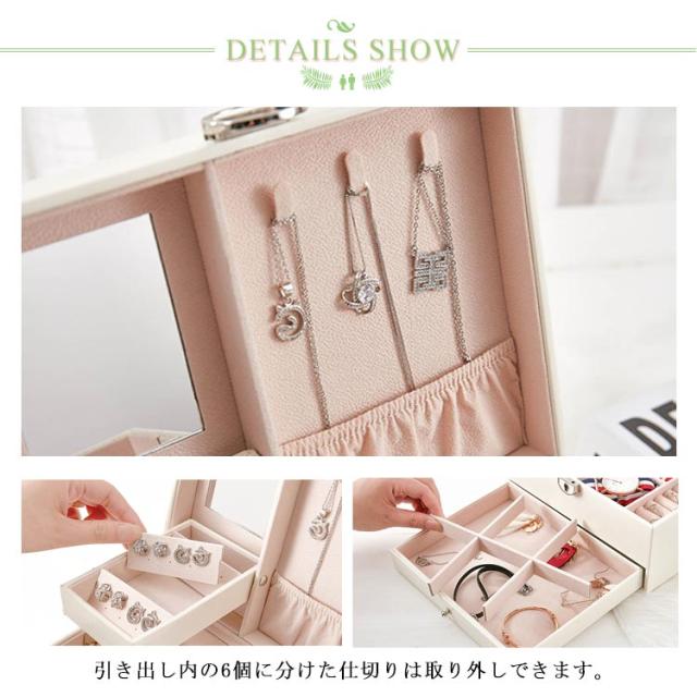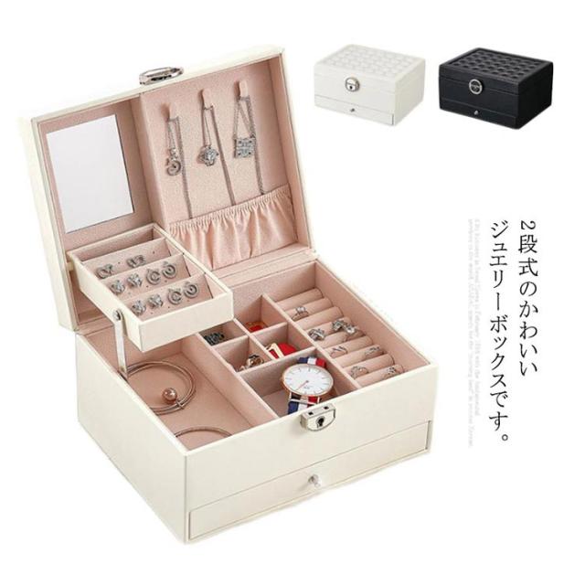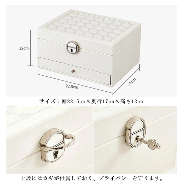 | 2段式のかわいいジュエリーボックスです。 鏡付きでアクセサリーをつけるのに便利です。 ピアスやリング、ネックレス、ヘアアクセサリーなどを整理できます。 サイズ:幅22.5cm×奥行17cn×高さ12cm 引き出し内の6個に分けた仕切りは取り外しできます。 上段にはカギが付属しており、プライバシーを守ります。 ギフトにも最適なシンプルで高級感あふれるジュエリーBOXです。 | |